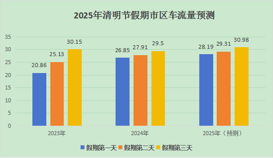 综合近年来清明节假期市区交通流量趋势,假期3天车流量呈现出每日平稳上升趋势,预测2025年清明节假期市区车流量达88.48万台次,日均车流量29.5万台次,同比2024年增长5%。